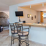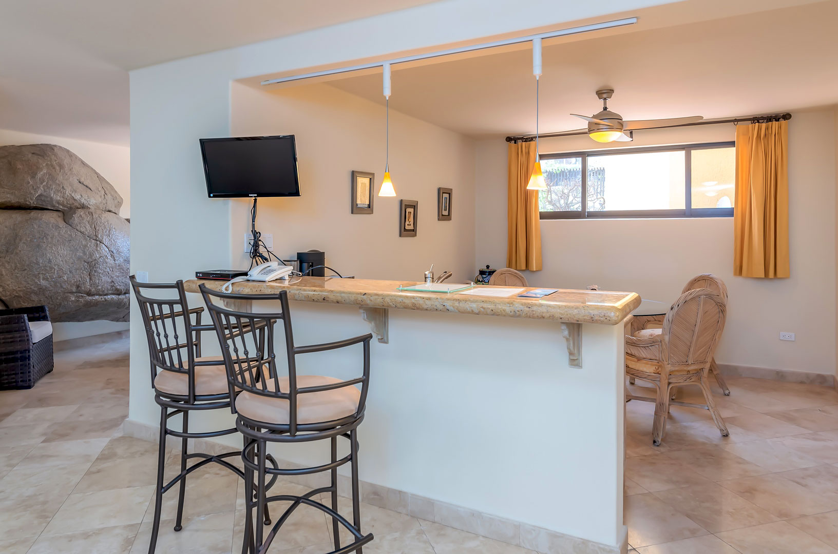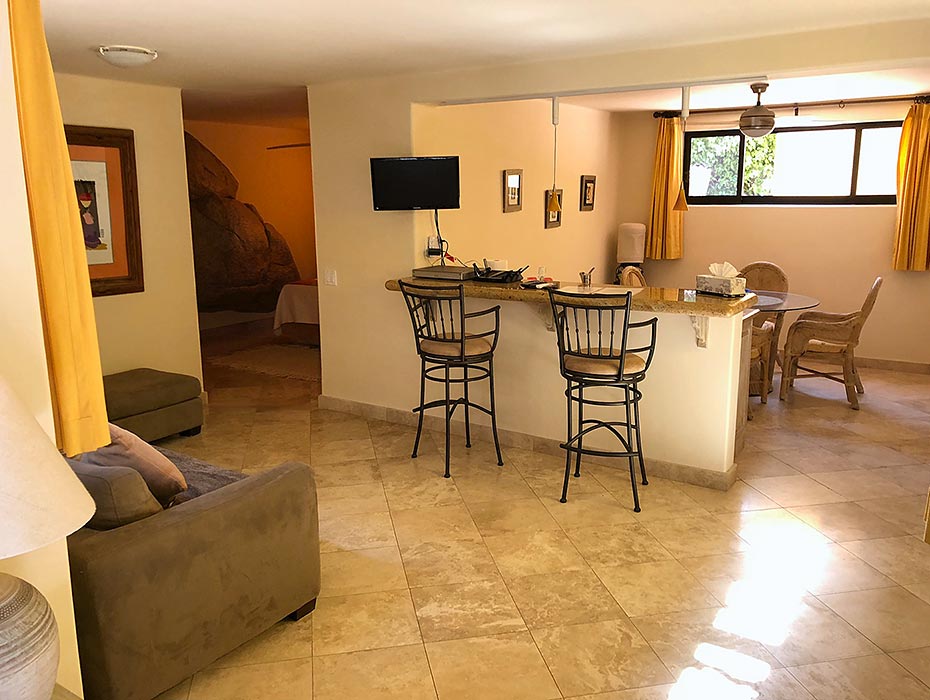 Spacious living & dining area with comfortable lounging chairs, wet bar and a large screen color TV (Smart TV);